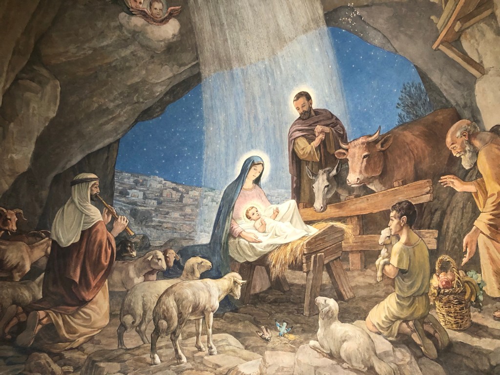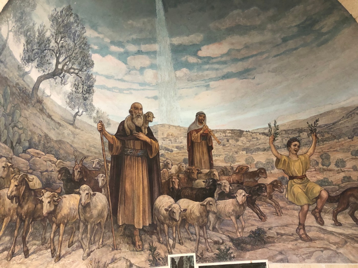 [Once at Shepherd’s Field] we entered a Franciscan chapel over the site believed to be where the angels appeared to the shepherds with good news of great joy. We entered the chapel, all 60ish of us and read the scriptures in Luke of the shepherds and their flock. We admired the paintings adorning the walls.