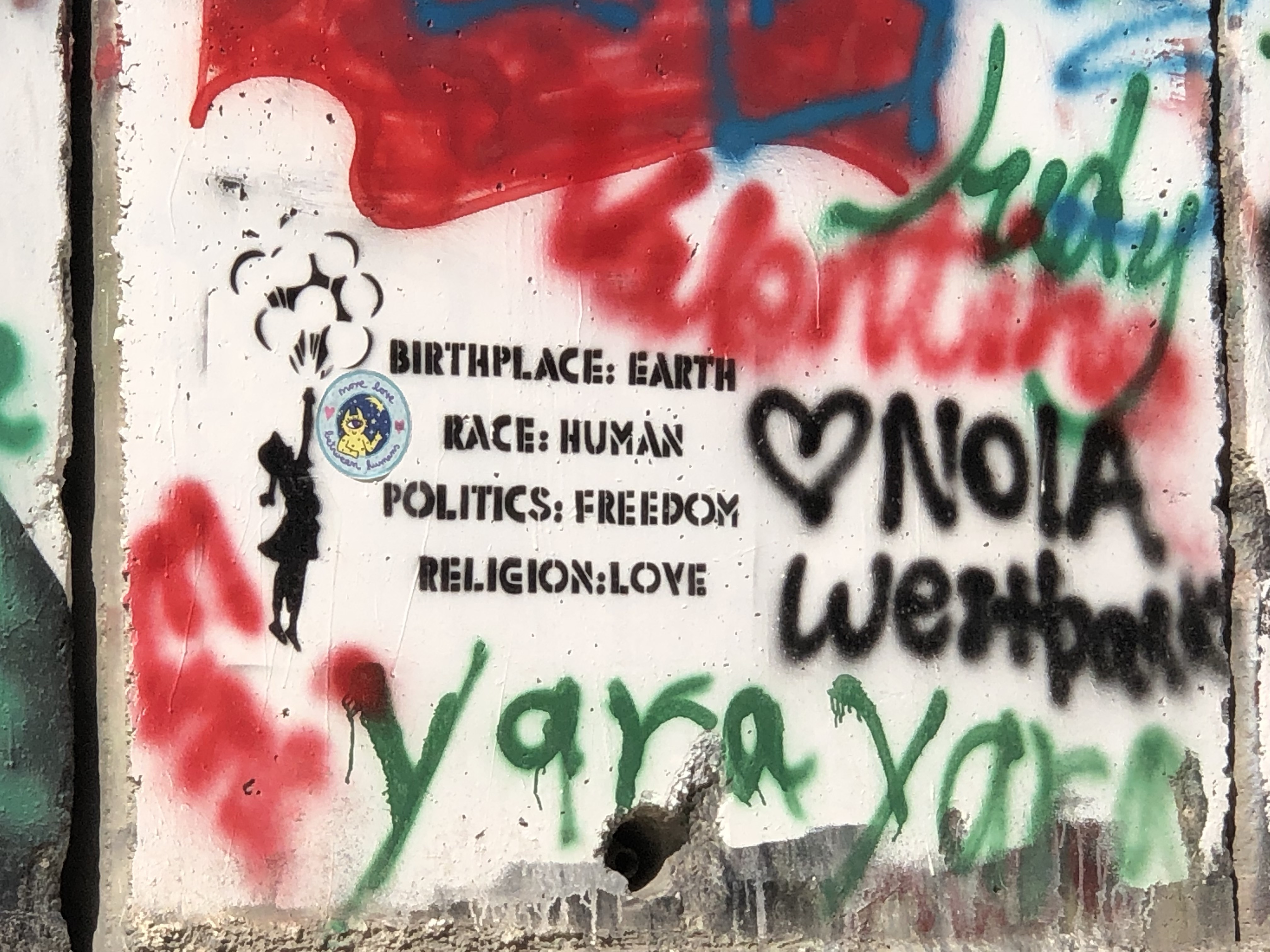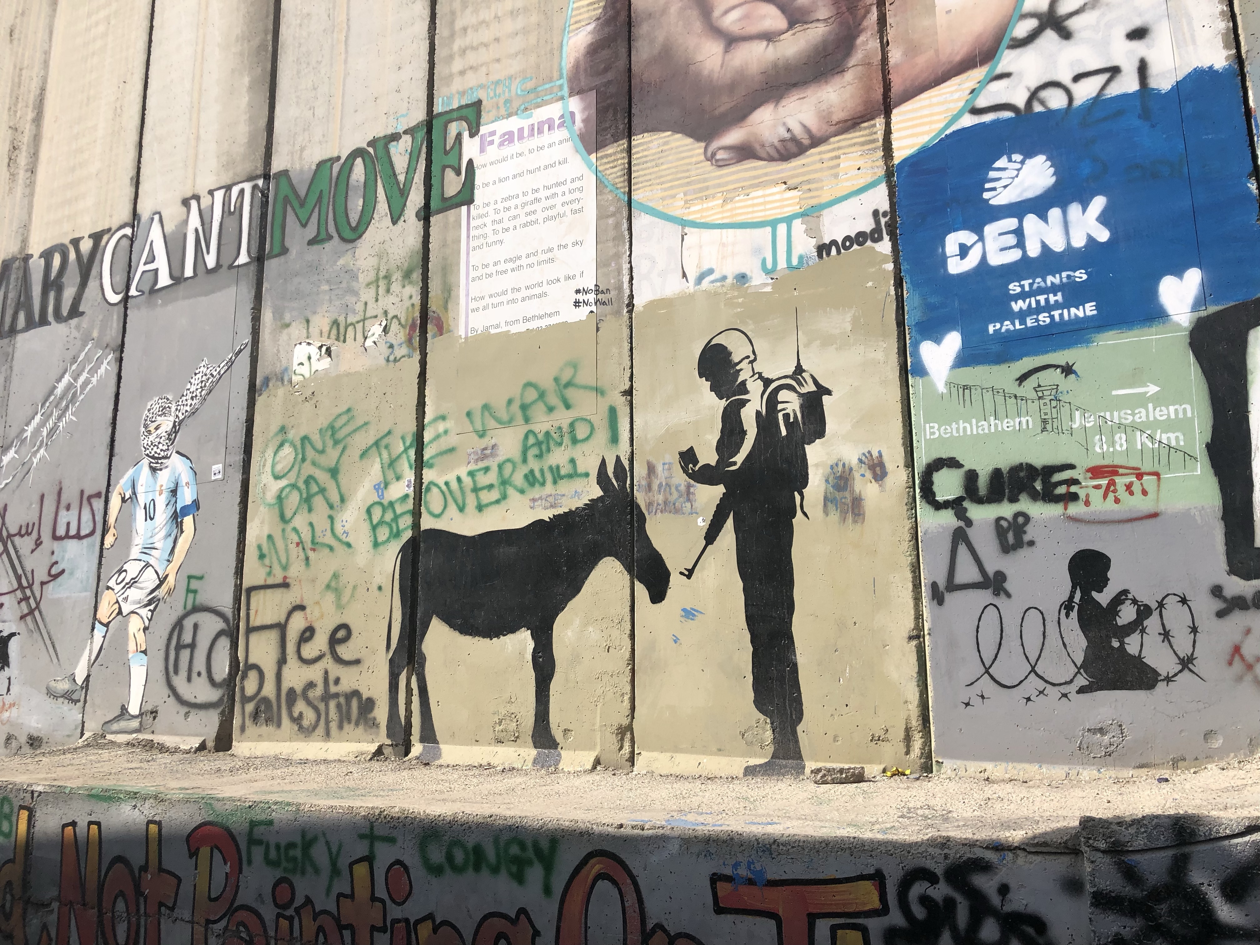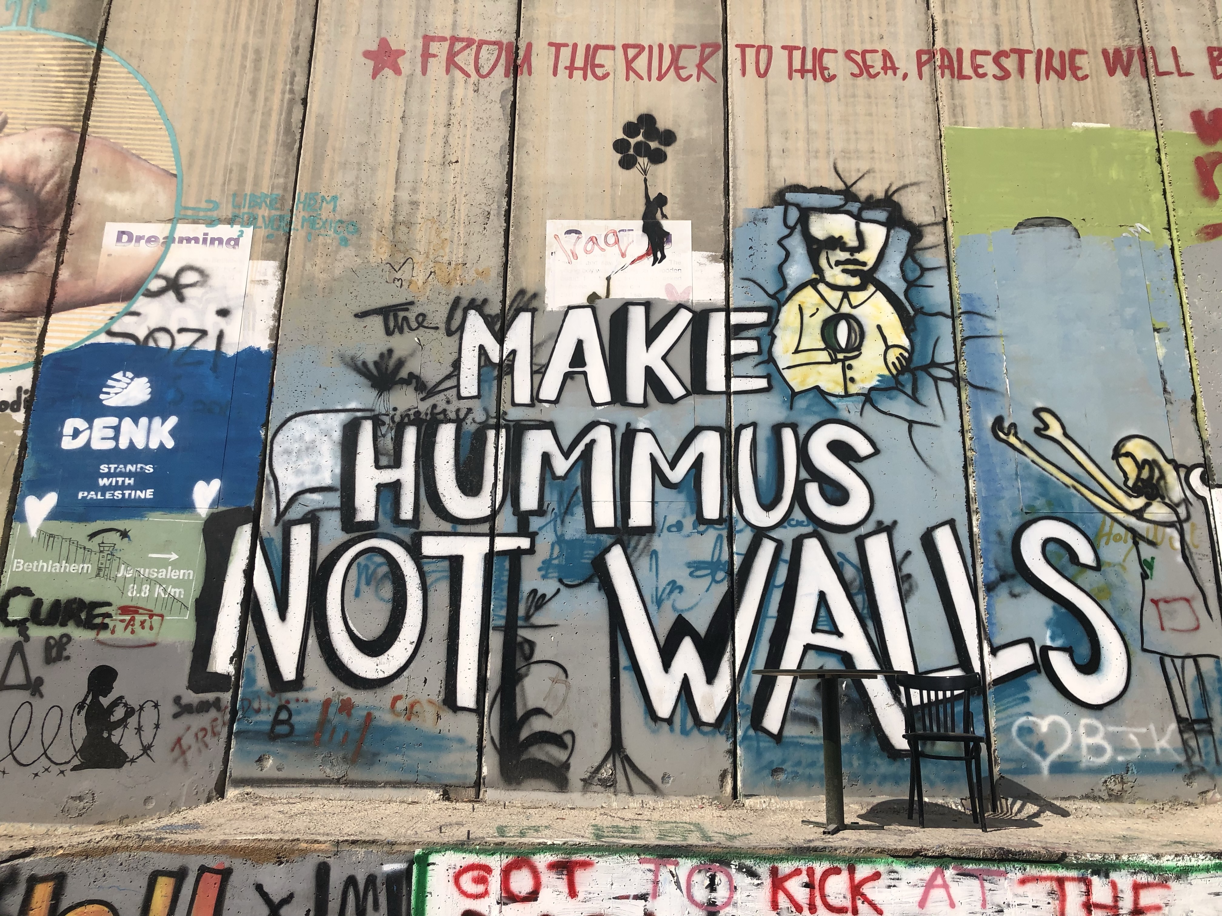 Today we visited the wall surrounding Bethlehem from Israel. We saw the graffiti art, the wishes of the people, the cries to tear down the wall, to make hummus instead, to have love and peace. It was a lot to take in. Seeing the wall… knowing these people were trapped inside.