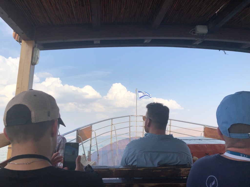 We all boarded a wooden boat, ready to depart across the Galilee. As we slowly made our way out, Mike pointed out the various places we had visited earlier in the day – Capernaum, Tabgha, the Primacy of Peter, Mount of Beatitudes, Magdala, and the Valley of the Doves. Seeing it all from the middle of the Galilee put everything into perspective.
